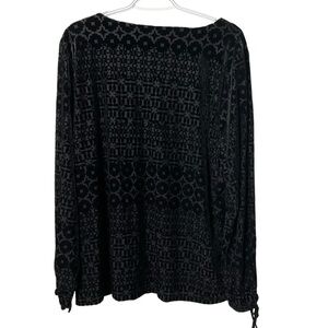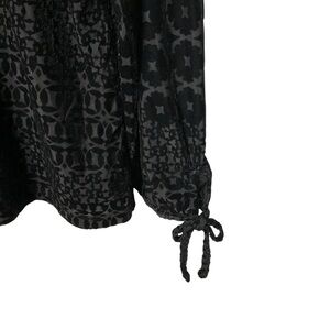 This black blouse features a relaxed scoop neck design and long bell sleeves that add a touch of elegance. The fabric is semi-transparent with an intricate geometric pattern, creating a textured look. The tie front detail enhances its stylish appeal, making it perfect for various occasions.