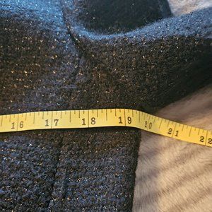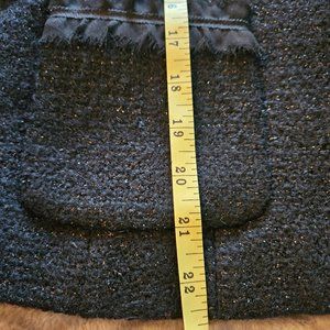 Questions? Leave a comment below! Talbots Black Shimmer Tweed Jacket Like New 3/4 Sleeve w/Ribbon Fringe Trim Size 10P. No stains or tears. 80% wool, dry clean only. 3 hidden snaps. Smoke free home. Same/next day shipping except on weekends.