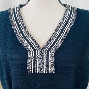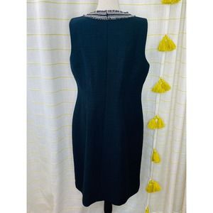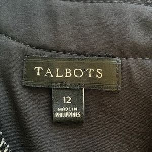 Talbots Black Cotton Tweed Sheath Dress Womens 12 Black and White Fringe Trim Sleeveless Mid Length Fully Lined Career Classic