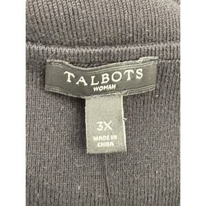 The Talbots Black V-Neck Sweater in size 3X is a classic and stylish addition to any woman's wardrobe. This sweater features a solid black color with a unique scalloped trim accent, adding a touch of detail to the tight-knit design. Made from a comfortable cotton blend material, this sweater is machine washable and suitable for all seasons. The 3/4 sleeves and V-neckline offer a flattering fit for plus-size women, making it a versatile and timeless piece for everyday wear.