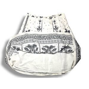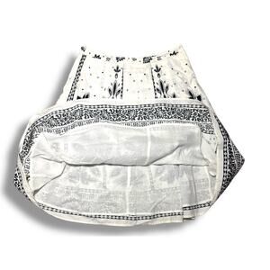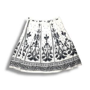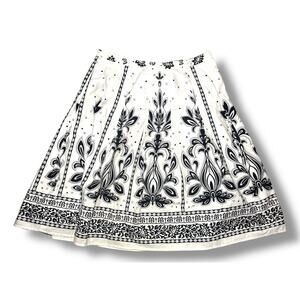 Beautiful Talbots women’s A-line skirt featuring a striking black and white floral border print design. Made of 100% cotton with a full cotton lining for structure and comfort. This classic mid-length skirt offers a flattering silhouette perfect for spring and summer wear.