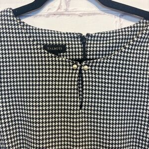 Classic and sophisticated, this Talbots midi dress features a timeless black and white gingham plaid pattern with elegant pearl detailing wt the neckline. The flattering silhouette includes a back zipper, subtle back slit, and comfortable stretch fabric—making it perfect for the office or any polished occasion. A refined piece for the classy, mature wardrobe.