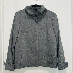 Black, white and gray stripe twill blend, “Jackie Fit” jacket. Front button closure. Fully lined. Front side pockets. Pleat down the back center. Wide collar. Long sleeves with slits on the cuffs that can be folded.