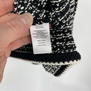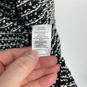 Excellent condition, pre-owned, Talbots Black White Tipped Tweed Sweater Blazer in Size Large. This is so elegant and pretty. Decorative buttons and trim around sweater blazer. See all pics and measurements below. Dress this up or down. Perfect for anyone's wardrobe. Hook closures down the front. Last pic you can see where stitching comes together.