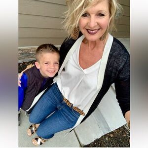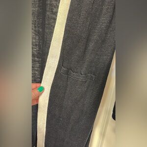 Stylish black and white cardigan. Functional pockets, no closure.. just an open cardi. Slight imperfections/holes in the lightweight linen throughout. Perfect for a chic look.