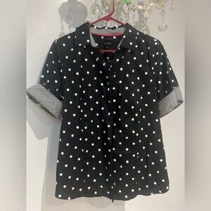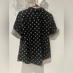 Chic black blouse with white polka dots. Striped accents on collar and sleeves.