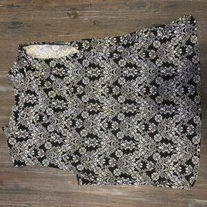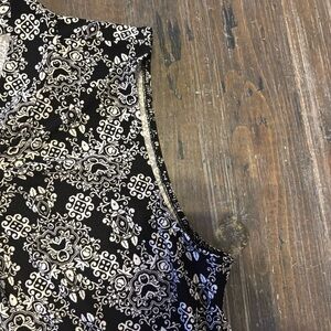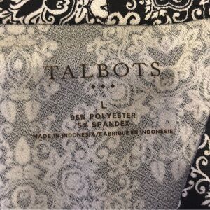 This sophisticated sleeveless blouse by Talbots showcases a striking black and white damask pattern that adds a touch of elegance. The notched collar enhances its stylish appeal, making it suitable for both casual and formal occasions.
