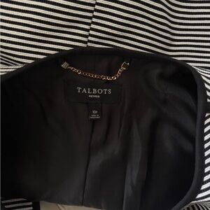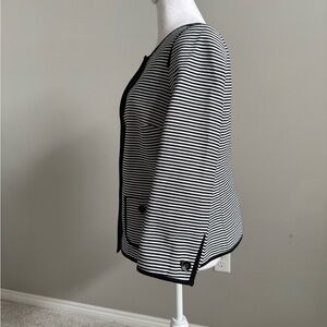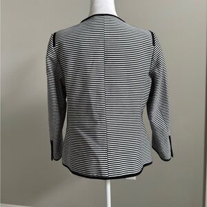 This sophisticated blazer from Talbots features a striking black and white striped pattern, offering a timeless and elegant look. The collarless design with black trim adds a touch of modernity, while the three-quarter length sleeves provide a chic and versatile style. Perfect for both professional and casual settings, this blazer effortlessly enhances any outfit. It is in like new condition, no flaws.