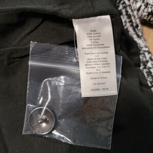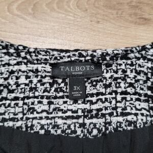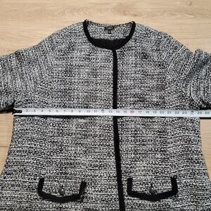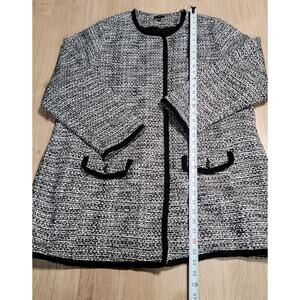 Chic tweed jacket. Open front design. Black trim accents. Perfect for layering.