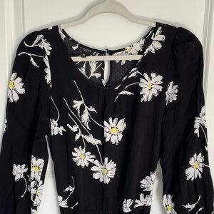 Delightful daisy print. Flattering fit & flare silhouette. Beautiful drape. Smocking accent at sleeves lends an extra feminine touch.