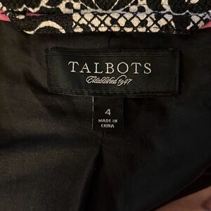 Keywords: Talbots, blazer, jacket, black and white, damask print, 3/4 sleeve, size 4, open front, womens blazer, career wear, business casual, classic, retro