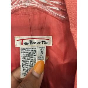Add a pop of color to your wardrobe with this stunning vintage Talbots blazer! This double-breasted blazer features a beautiful pink hue and eye-catching gold buttons, perfect for adding a touch of sophistication to your office attire or a chic, vintage flair to any outfit. This blazer is in great condition and ready for its new home. It's a size 6 and offers a comfortable and flattering fit. The classic design ensures it will remain a timeless piece in your closet for years to come. Don't miss the chance to own this beautiful Talbots blazer. It’s perfect for adding a touch of elegance and vintage charm to any look. Grab it now and elevate your style!