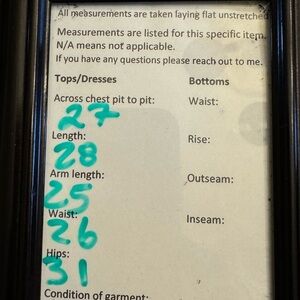 Pit to pit 27”, length 28”, arm length 25", waist 26", hips 31"