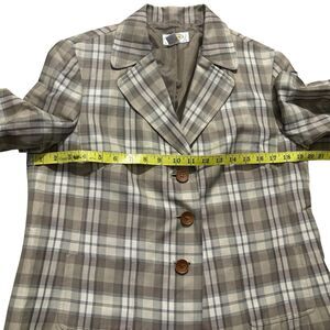 This Talbots Blazer in size 12P is a classic and stylish piece featuring a tan plaid pattern with wood buttons. Made from a ramie, polyester, and linen blend, this short jacket with 3/4 sleeves is perfect for various occasions, including parties, casual outings, formal events, workwear, and business meetings. The vintage-inspired blazer is lined with polyester and exudes a preppy, 90s vibe, making it a versatile and timeless addition to any woman's wardrobe.