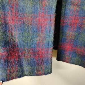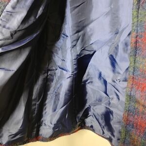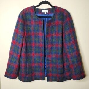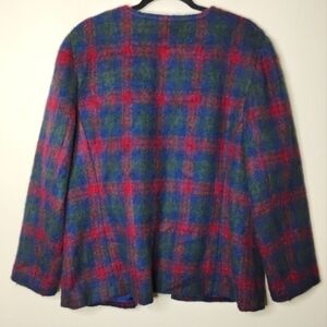 Chic and cozy, this vintage-inspired Talbots blazer features a bold plaid pattern in rich hues of red, blue, and green. Crafted from a soft wool blend, it offers both warmth and style. The open-front design and collarless neckline add a modern, minimalist touch, perfect for layering over a blouse or sweater. Fully lined for a smooth fit and finished look.