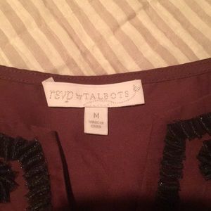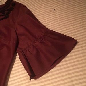 Beautiful burgundy blouse ๐ with bell ๐ sleeves. Trim is done with black ribbon and sequins. Great look with black capris and black kitten heels!! Wash inside out and line dry. 68% cotton, 32% silk