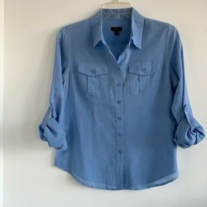 This light weight button down is a classic for your closet. It has lived some life but has a lot of life left! Sleeves can be worn long or rolled up to elbow with tab & button.