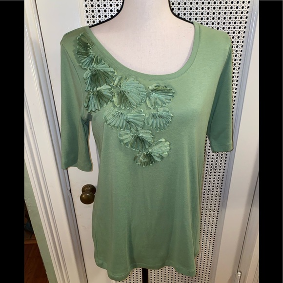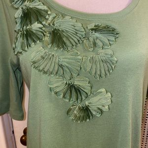 Lovely ribboned floral across right side. Adds a lovely touch of uniqueness to this soft , short sleeve blouse!