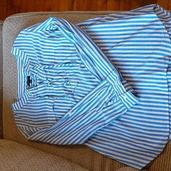 Talbots blue and white striped blouse. 100% Lightweight cotton. Size medium. 2 small pockets and front string closure. Armpit to armpit 20". 26" length. 23" sleeve. Used once in Great Condition!