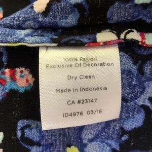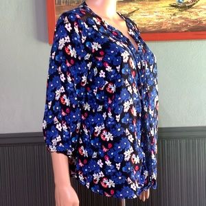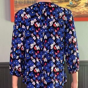 Pretty floral v neck blouse. Made of rayon and in great used condition. Bin 47