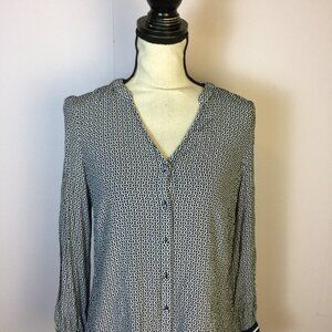 Talbots Blouse Shirt Top Sz M Womans Blue White V-neck Button Front Long Sleeve