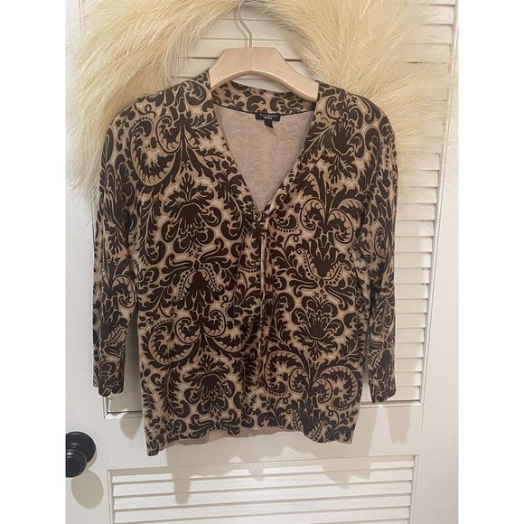 Talbots Blouse Size Large Womens Multicolor Silk Long Sleeve BROWN V Neck Tie