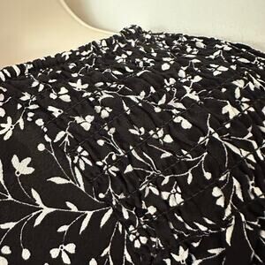 Black with white floral pattern. V-Neck, with a full button down. Cloth buttons. Smocking at shoulders. Flutter sleeves. Short Sleeve. Flowy.