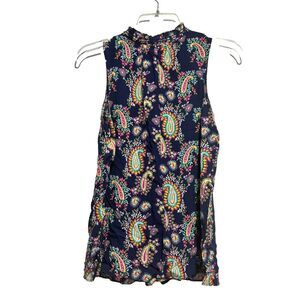 Talbots Womens Blouse Top XS Navy Multi Paisley Floral Sleeveless Split Neck