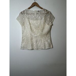 Talbots Blouse Womens 10 Cream Ivory Embroidered Pure Silk Sheer Overlay Cami