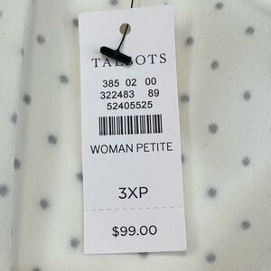 The Talbots Blouse is a stylish and comfortable women's top in size 3 XP. This white polyester polka dot blouse features a relaxed fit and long sleeves, making it perfect for casual occasions. The pullover style with a round neck and woven fabric adds to its classic and preppy look, while its lightweight and easy-care features make it a versatile option for all seasons. Ideal for petites, this blouse is a must-have in any woman's wardrobe, suitable for summer, fall, and spring wear.