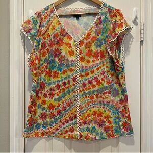 Talbots Blouse Women’s XL Rainbow Floral Embroidered Trim Cotton Happy Bohemian