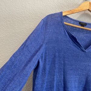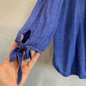 Talbots Blue 100% Linen Knit Tie Sleeve Notched V Neck 3/4 Sleeve Top Size Large