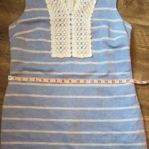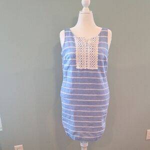Talbots dress in a crisp blue with white stripes and cotton lace embellishments. Perfect for any occasion. can be casual worn with sandles or worn on a summer day to the office. Or put heals on and it can be dressed up.