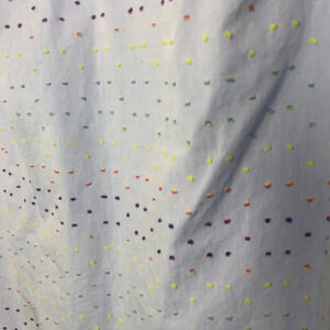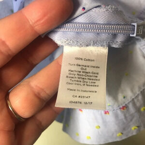 This is the cutest summer blouse! Light chambray type blue with ruffled collar. The rainbow colored polka dots are fuzzy to the touch. Very, very cute! In very good used condition.
