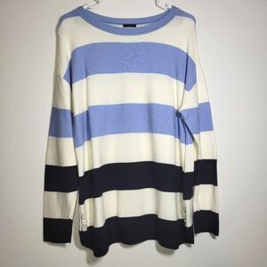 Item: women's blue striped sweater with long sleeves and crew neckline, scalloped hemline with button detail, size XL petite