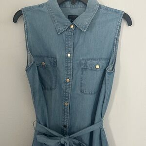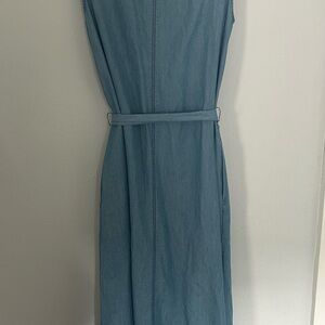 This sleeveless midi dress from Talbots features a notched collar and a buttoned front, perfect for casual or work settings. The pleated design adds a touch of elegance to the classic blue color, making it a versatile addition to your wardrobe.