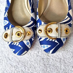Talbots Blue Fabric Geometric Leaves Creamy Leather Gold Buckles Slip On Flats