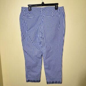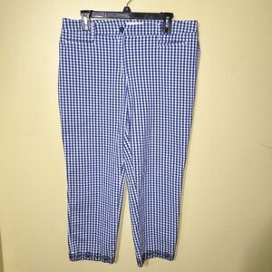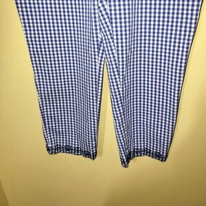 Item: women's flat front blue and white gingham cropped capri pants, size 12, beautiful embroidery at the bottoms
