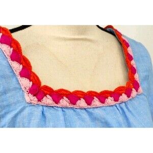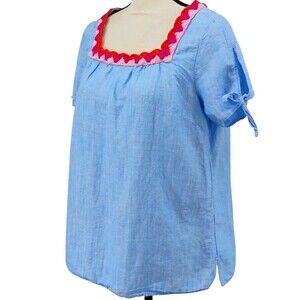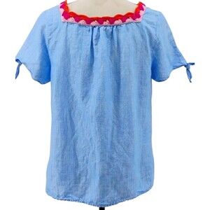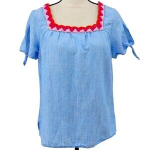 Talbots Blue Linen Top Small Crochet Square Neck Short Sleeve Coastal Chic