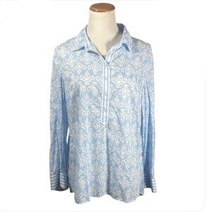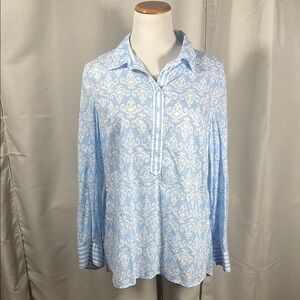 This elegant Talbots top features a soft blue hue complemented by a delicate white pattern, offering a sophisticated look. The long sleeves and notched collar add a touch of classic style, making it a versatile addition to any wardrobe. Crafted for comfort, this button-down tunic shirt is perfect for both casual wear .