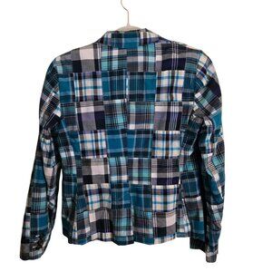Elevate your preppy style with this Talbots blue madras plaid blazer. Perfect for a polished, classic look, this cotton blend blazer is fully lined with pockets. Ideal for versatile styling. Retail $150