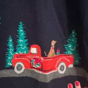 Great pre owned condition. Nylon and lambs wool. Has a cute pick up truck, dog, and Christmas tree design on the front. 3/4 sleeves with buttoned collar.