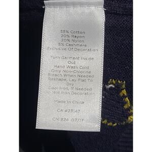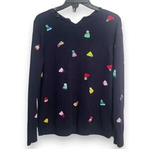 Description: Talbots Blue Party Winter Hat Sweater, size Large Petite, good condition. Features embroidered and embellished motifs, crew neckline, keyhole back with ribbon, long sleeves, hits slightly above hips, imported, perfect for festive or casual wear despite minor piling under arms. Smoke-free home, fast shipping, bundle to save!