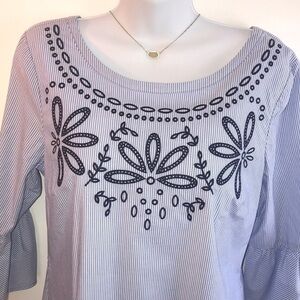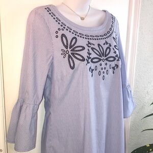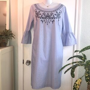 Talbots blue pinstriped dress with beautiful floral navy embroidery, round neckline, 3/4 sleeves with bell ruffle, hidden back zipper, darts in back for a fitted and flattering look, fully lined, 100% Cotton, in excellent pristine condition, like new, no flaws. *missing the belt tie, but can be worn without one*