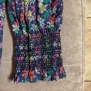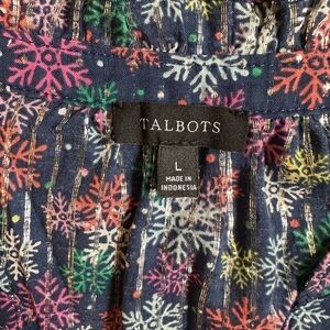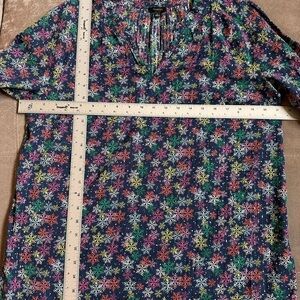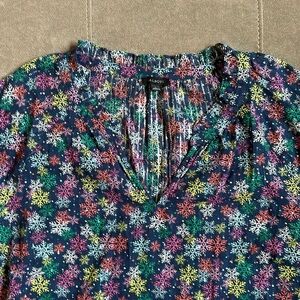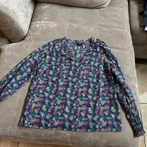 This Talbots blouse showcases a relaxed fit with a smocked design, featuring a vibrant floral pattern on a blue base. The mandarin collar and cuffed sleeves add a touch of elegance, making it a versatile piece for any occasion.