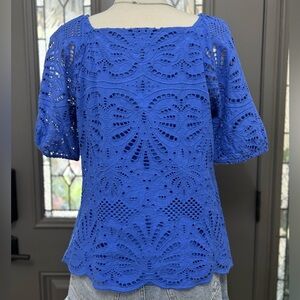 Talbots Blue Square Neckline Eyelet Puff Sleeve Blouse