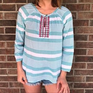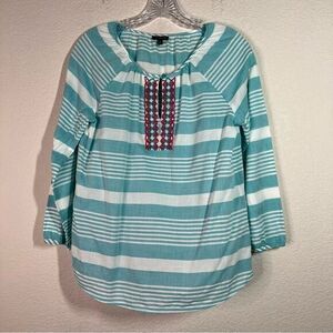 Talbots Blue Striped 3/4 Sleeves Aztec Beaded Blouse Womens Size Small