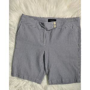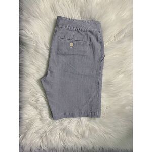 These Talbots shorts feature a white and blue striped pattern, a high rise, a two button and zipper closure, pockets and a mid length inseam.