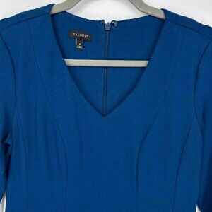 This elegant sheath dress from Talbots features a vibrant blue hue and a sophisticated V-neckline. Designed with long sleeves, it offers a sleek silhouette perfect for both work and cocktail occasions. The dress's simple yet refined style makes it a versatile addition to any wardrobe.