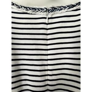 This Talbots Blue & White Striped Sleeveless Dress in size 18 is a classic and stylish addition to any woman's wardrobe. Made from a comfortable blend of polyester, spandex, and cotton, this knee-length A-line dress features a round neckline and back zipper closure. The dark navy blue and white stripes give it a flattering and versatile look, perfect for a variety of occasions. With its designer brand and plus size fit, this dress is sure to make a statement and provide a comfortable and chic option for any woman looking for a timeless and flattering outfit.
